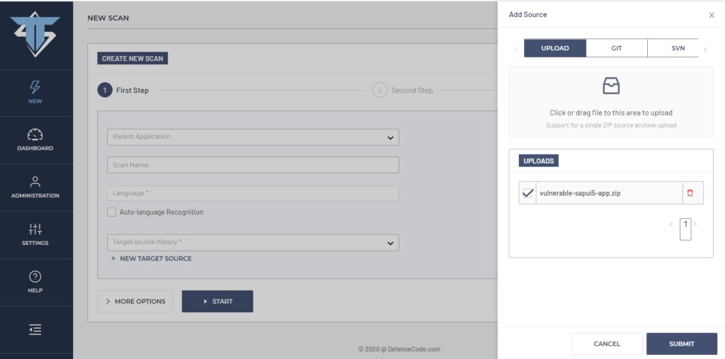 Once we are logged in with valid credentials, we will initiate a new scan on our vulnerable SAPUI5 application. To select a source code target, we have multiple options, we can upload the source code in a ZIP archive, alternatively select GIT, SVN, TFVC or S3 repository where the source code is located, or select the local directory on the hard drive (which is disabled in ThunderScan configuration by default but can be changed). For this demonstration we will upload the source code as a ZIP archive.