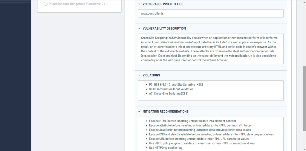 If we scroll down the right part of the window we can see the details about vulnerable project file and details about the specific vulnerability along with the vulnerability description, security compliance standards violation and mitigation recommendations.